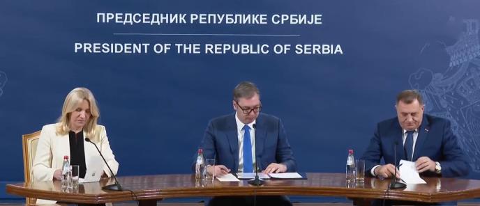 BEOGRAD - Predsednik Republike Srbije Aleksandar Vučić primio je novoizabranog srpskog člana Predsedništva Bosne i Hercegovine Željku Cvijanović i novoizabranog predsednika Republike Srpske Milorada Dodika u zgradi Predsedništva na Andrićevom vencu, posle čega se obratio javnosti.
