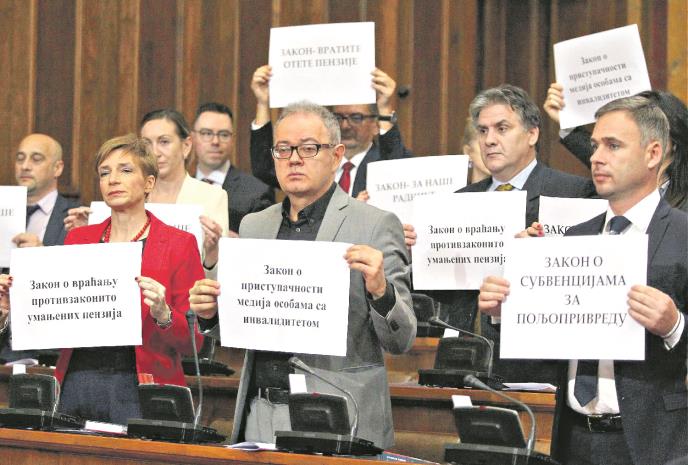 Naime, između ostalog, na dnevnom redu su bile izmene Zakona o medijskom javnom servisu, finansijski planovi državnih tela i agencija, predlog Zakona o unutrašnjim poslovima, potvrđivanje pravnih ugovora sa UAE, Brazilom i Mađarskom. Ali poslanici opozicije su očito imali drugačije planove od rasprave na ove teme, pa su tako na samom početku sednice ustali sa svojih mesta i u znak protesta držali transparente sa svojim predlozima zakona. Kako kažu, zbog načina na koji predsednik Skupštine Srbije Vladimir Orlić zakazuje sednice, oni nisu u mogućnosti da ih predlože jer nemaju dovoljno vremena.