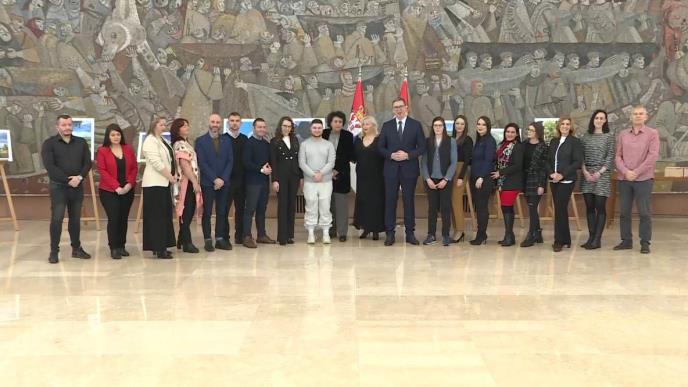 Predsednik Srbije Aleksandar Vučić dodeljuje nagrade autorima fotografija sa konkursa "Naša najlepša Srbija" na izložbi njihovih fotografija u Palati Srbija.