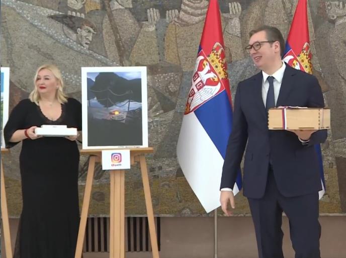 Vučić je autorima najlepših fotografija uručio poklon koji se nalazio i drvenoj kutiji sa mašnom u bojama naše zastave.