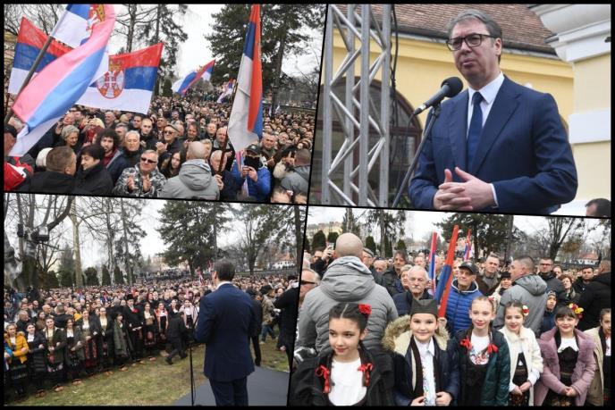 KRAGUJEVAC - Čestitam vam praznik, naš svojevrsni Dan pobede! Sretenje je srpsko ime i prezime! Živela Srbija!, poručio je predsednik Srbije Aleksandar Vučić jutros iz Kragujevca na svečanosti proslave Sretenja, Dana državnosti Republike Srbije.