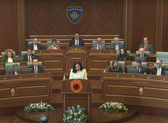 Kako prenose prištinski mediji, amblem OVK na govornicu je postavila poslanica Demokratske partije Kosova Ganimete Musljiu.