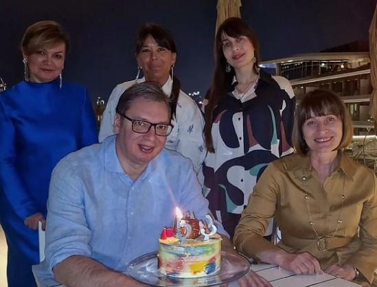 "U Kataru je skoro ponoć. Ujutro idemo na sastanke u 7 sati i želim da se odmorim i dobro pripremim. Ipak, ove divne dame, pošto nisam bio naročito druželjubiv, donele su mi tortu za 53. rođendan. Hvala što su tu već deset godina i hvala svima kojima neću stići da odgovorim sutradan. Verujem da ćemo i ovde u Kataru napraviti dobar posao za našu Srbiju! Živela Srbija", napisao je predsednik ispod fotografije.