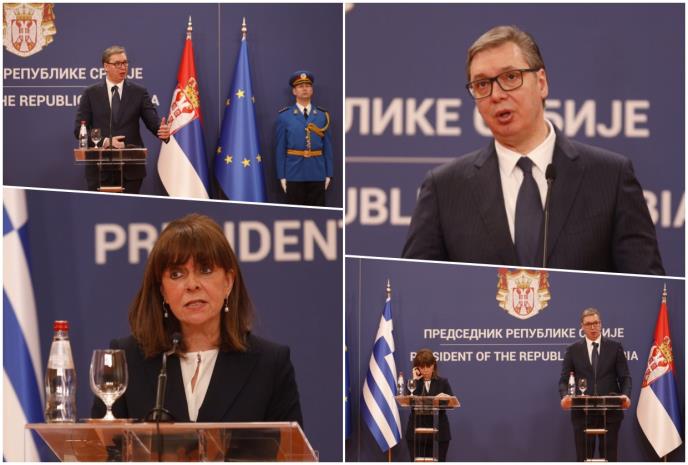 Predsednik Srbije Aleksandar Vučić ugostio je predsednicu Grčke Katerinu Sakelaropulu, a nakon sastanka zvaničnika i delegacija, usledilo je i obraćanje medijima.