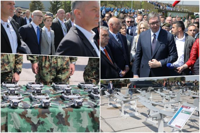 Predsednik Srbije Aleksandar Vučić u prisustvu mađarskog premijera Viktora Orbana i gostiju iz Republike Srpske obilazi naoružanje i vojnu opremu na aerodromu Batajnica.