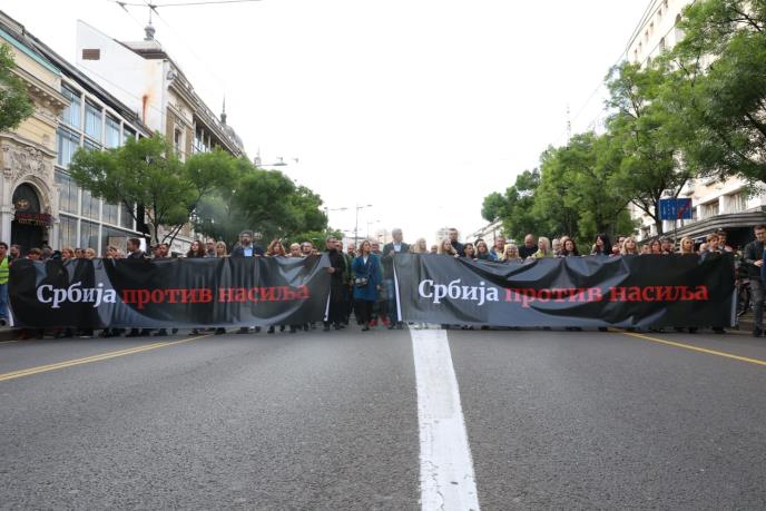 - Na protestu borbe protiv nasilja čuli smo najgore psovke na račun majke Aleksandra Vučića, na račun samog Aleksandra Vučića, na račun Aleksandra Vulina, čuli smo kako bi da otkidaju glavu Vučiću. Količina boli koju osećamo zbog pobijene dece srazmerna je količini gađenja koju osećamo prema onima koji lešinare nad pobijenom decom.