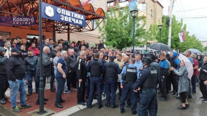 Kosovska policija je šok bombama i suzavcem rasterala okupljene Srbe ispred zgrade opštine u Zvečanu, a da bi nakon toga upala i u zgradu opštine u Zubin Potoku.