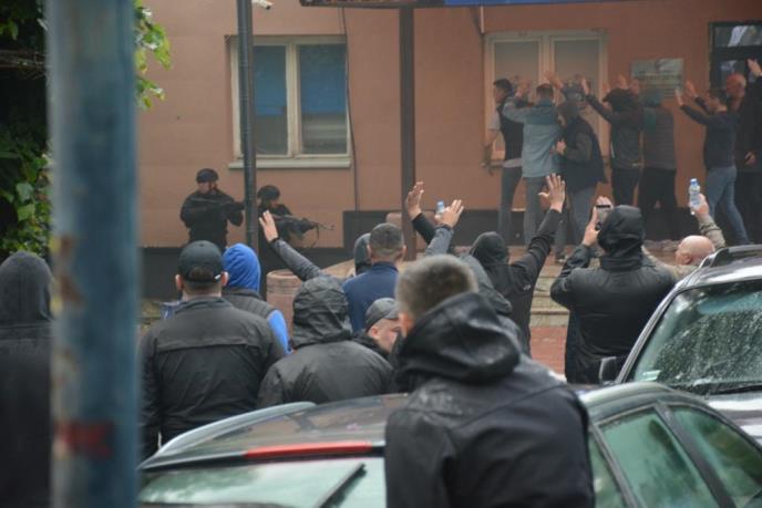 Na jednoj od fotografija iz Zvečana, tokom jučerašnjeg napada na Srbe, vidi se kako su kosovski policajci satima držali ljude na nišanu, dok su pokušavali da upadnu u opštinske zgrade.