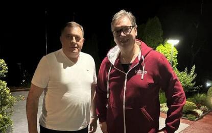 Predsednici Srbije i Republike Srpske Aleksandar Vučić i Milorad Dodik večeras zajedno prate prenos košarkaške utakmice plej ofa Aba lige, između Crvene zvezde i Partizana.