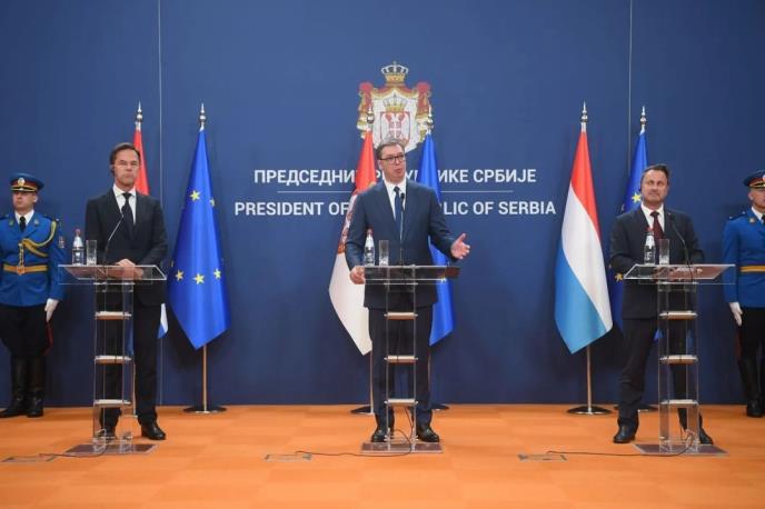 Predsednik Srbije Aleksandar Vučić obratio se večeras javnosti zajedno sa predsednicima vlada Kraljevine Holandije Markom Ruteom i Velikog Vojvodstva Luksemburg Gzavijeom Betelom, u Palati "Srbija".