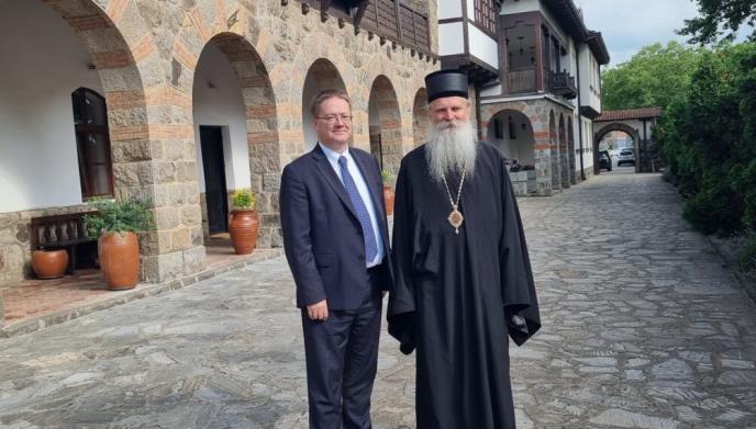 Episkop raško-prizrenski Teodosije sastao se danas u manastiru Gračanica sa britanskim ambasadorom u Prištini Nikolasom Abotom.