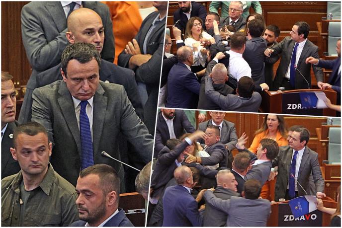 Ne zna se tačno šta se dogodilo, ali je Kurti u jednom trenutku zaliven vodom i poslanici su počeli da se okupljaju, nakon čega je došlo do tuče, piše Koha.
