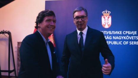 Predsednik Srbije Aleksandar Vučić i svetski priznati politički komentator Taker Karlson sastali su se danas u ambasadi Srbije u Budimpešti.