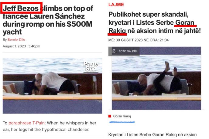 Albanski mediji pod kontrolom ne biraju sredstva za napad na Srpsku listu, a večeras im je meta bio njen predsednik Goran Rakić! Oni su iskoristili lažnu vest koja se pojavila (i ubrzo demantovana) na društvenim mrežama da je Rakić navodno uslikan na jahti sa nepoznatom devojkom, iako se na slikama ne nalazi Rakić već milijarder Džef Bezos sa svojom verenicom Lorin Sančez.