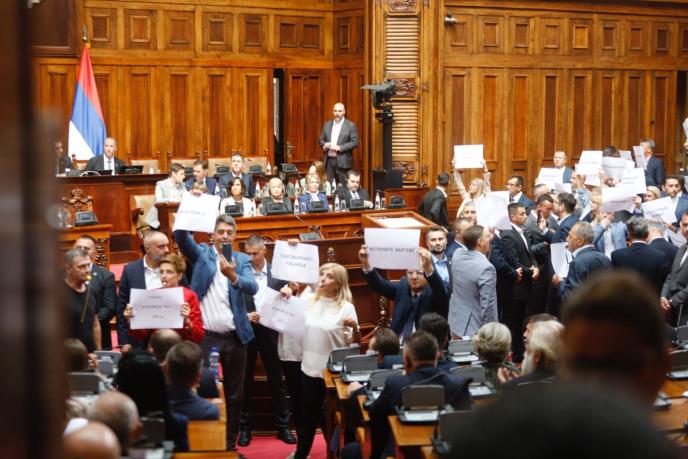 Međutim, deo opozicije, njih svega 38, nastavio je sa urlicima, zviždanjem, lupanjem, te ga nisu ni saslušali.