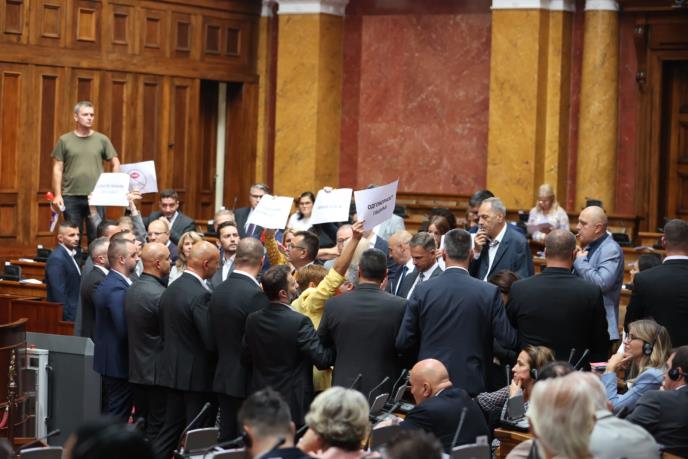 Podsetimo, nakon što su juče počeli sa pokušajem blokade rada parlamenta tako što su sve vreme vikali i duvali u pištaljke, deo opozicionih poslanika isto ponavlja i na današnjoj sednici Skupštine, uz još veću buku i trube, a Aleksandar Jovanović Ćuta otišao je najdalje u nezrelom i nedoraslom ponašanju i popeo se na skupštinsku klupu u trenutku javnog glasanja i zakletve novog ministra privrede Slobodana Cvetkovića iz SPS.
