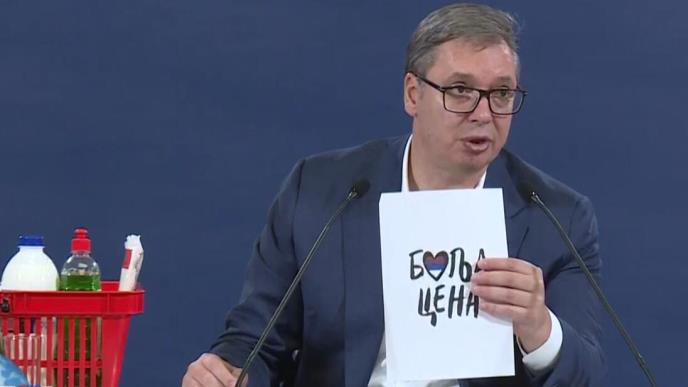 "Pileći parizer, čija je redoivna cena 399 dinara od srede će koštati 259,99 dinara, jogurt će, umesto 164,90 dinara koštati 139,90 dinara, deterdžent za suđe umesto 126 koštaće 69,99 dinara", rekao je Vučić.