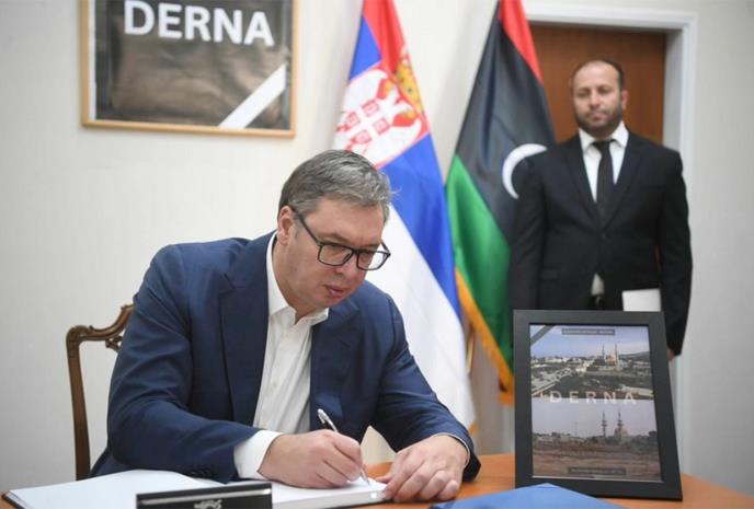 Predsednik Srbije Aleksandar Vučić upisao se danas u knjigu žalosti u ambasadi Libije, povodom strašnih poplava koje su pogodile ovu zemlju i odnele na hiljade života.