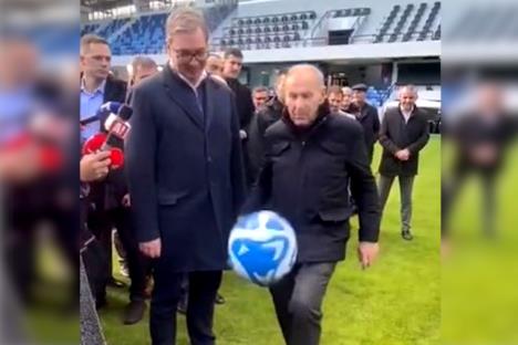 Tokom obilaska terena, Vučić je sa predsednikom FSS Draganom Džajićem ušao u "okršaj" - pimplovanjem lopte.