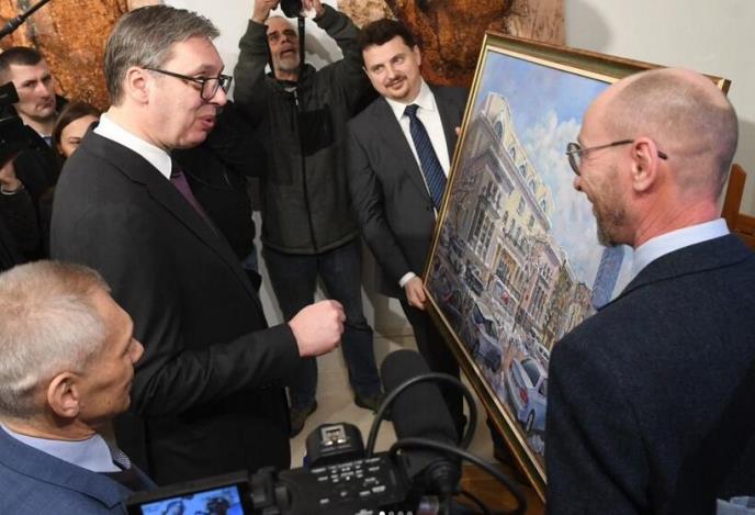Predsednika Vučića dočekali su direktor Ruskog doma Jevgenij Baranov i ambasador Rusije Aleksandar Bocan-Harčenko. Vučiću je u Ruskom domu uručena knjiga, članska karta biblioteke i slika za koju je rekao da će biti izložena u Predsedništvu.