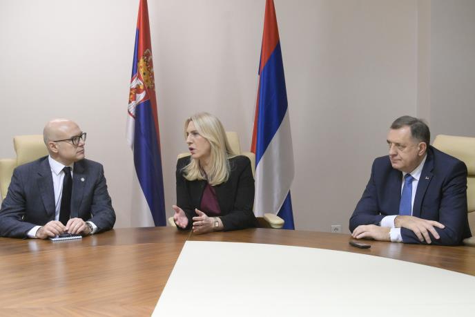 Potpredsednik Vlade i ministar odbrane Miloš Vučević sastao se danas sa srpskim članom Predsedništva BiH Željkom Cvijanović i predsednikom Republike Srpske Miloradom Dodikom u Administrativnom centru Vlade Republike Srpske u Istočnom Sarajevu.