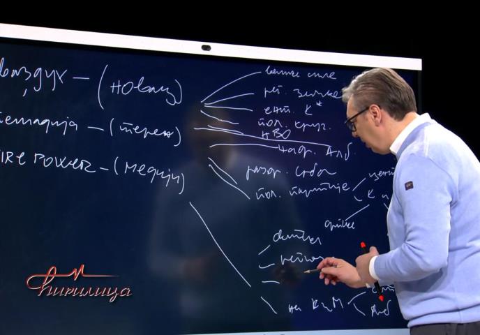 - Oni to rade svi zajedno ne bi li na različite načine rušili Srbiju. Sada ću pokazati kako ja to gledam - nekada kroz šah, nekada kroz rat. Kako oni to rade? Potrebna vam je prevlast u vazduhu, u svakom ratu, to ćemo da nazovemo u politici, to je novac. Potrebna vam je pešadija - stanje na terenu, potrebna vam je artiljerija, tenkovi i sve drugo - to su mediji. Ako pogledate novac, on dolazi sa tri strane jedan je iz velikih svetskih sila, drugi je regionalne zemlje koje imaju različite interese da utiču na slabljenje Srbije, imate entitet Kosovo, kako ga nazivaju i imate ih iz različitih političkih krugova i nevladinog sektora, tu govorim o raznim rokfelerima, fondacijama...