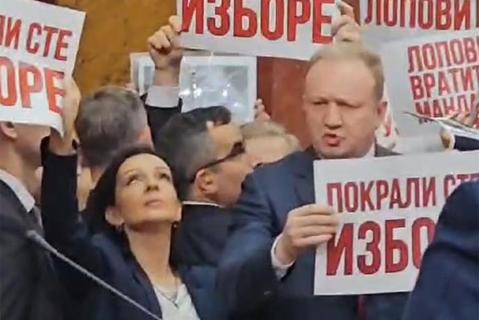 Potvrđivanje poslaničkih mandata prekinuli su zvižduci, negodovanje, pištaljke i transparenti dela opozicije, ali i parole sa galerije iz redova "Srbija ne sme da stane".