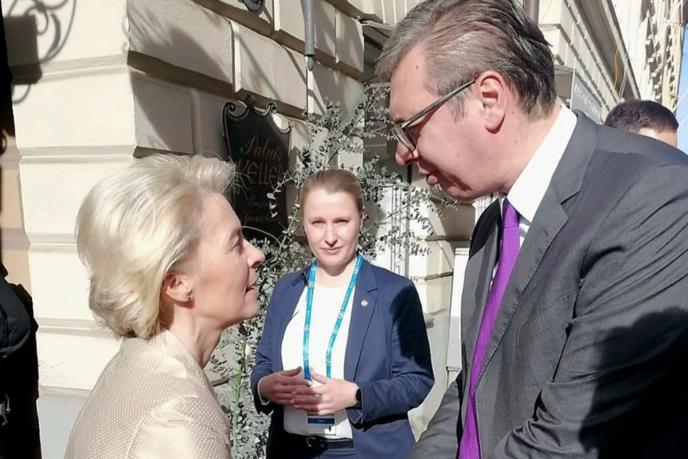 "Sa predsednicom Evropske komisije Ursulom fon der Lajen sam nakratko razgovarao o važnim regionalnim i svetskim temama po pitanju bezbednosti i spoljne politike. Još jednom sam ponovio čvrstu opredeljenost Srbije za nastavak i ubrzanje svog evropskog puta", napisao je predsednik Vučić na Instagramu.