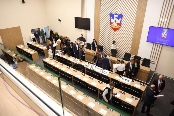 Da u sali nema kvoruma, bilo je poznato već na početku jučerašnje sednice, što je predsedavajući Toma Fila iz SPS i konstatovao. Odbornici liste "Srbija protiv nasilja" su u skupštinskoj sali držali transparente s natpisima "Pokrali ste izbore" i "Beograd vas neće".
