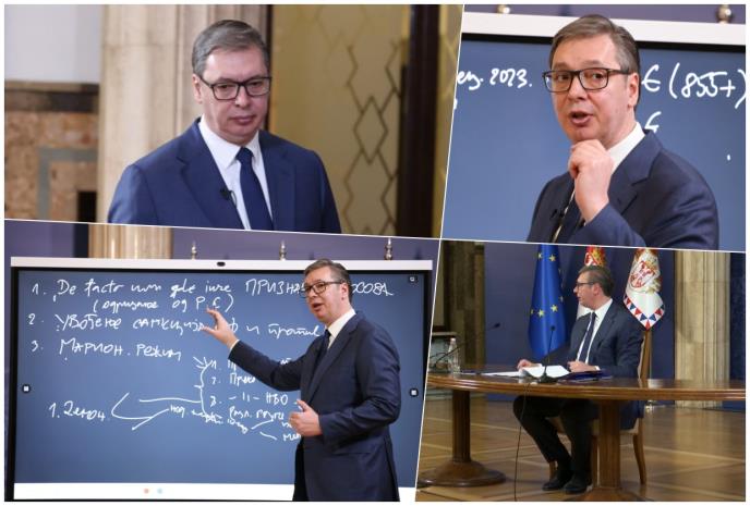 - Stalna demonizacija Srbije zbog nedemokratskih odnosno, autokratskih tendencija. Imate podelu na dva dela, izbori nedemokratski, bez dokaza, a drugo je loše stanje u medijima. Drugo je čuvena Banjska, i to je postalo opšte mesto iz dva razloga. Jedan je da bi se uvek smanjila krivica Kurtijevog režima, da se ne bi pisalo o proterivanju Srba. Treće, ono što možete da vidite svaki dan, stvaranje bezbrojnih, besmislenih i izmišljenih afera u smislu opšte atmosfere. Svakog dana izmislite nekog Vučićevog saradnika. Ovo sam samo želeo da ljudima pokažem kako to izgleda, zašto se takve stvari dešavaju, da ne misle da je to slučajno. To nije izazvano stvarnom brigom za situaciju u Srbiji. Ukoliko Srbija bude uspevala da drži slobodarski kurs i ne bude pala pod one pod kojima je bila 12 godina, kada je razorena cela Srbija, nesumnjivo je da će se ovakve stvari nastaviti. Ima nekoliko ljudi u zemlji koji hoće da se bore, ostali bi da se sakriju. Srećan sam što imam saradnike koji hoće da se bore - rekao je predsednik.
