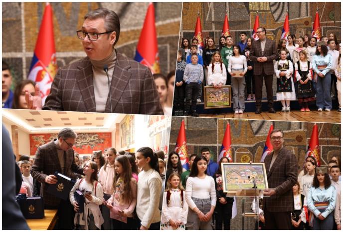 Predsednik Republike Srbije Aleksandar Vučić primio je u Palati Srbija učenike osnovnih škola sa Kosova i Metohije.