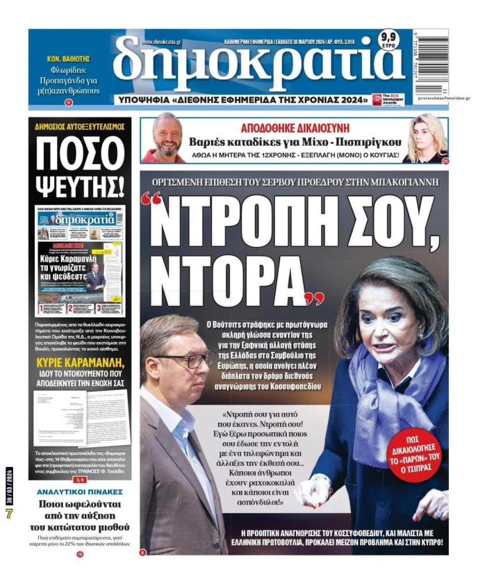 Grčka „Demokratija“ na naslovnici, uz fotografiju Vučića i Bakojanijeve, poručuju „Sram te bilo, Dora“, a unutar lista prenose obraćanje predsednika Srbije o toj temi, ali i osudu postupka Bakojanijeve.
