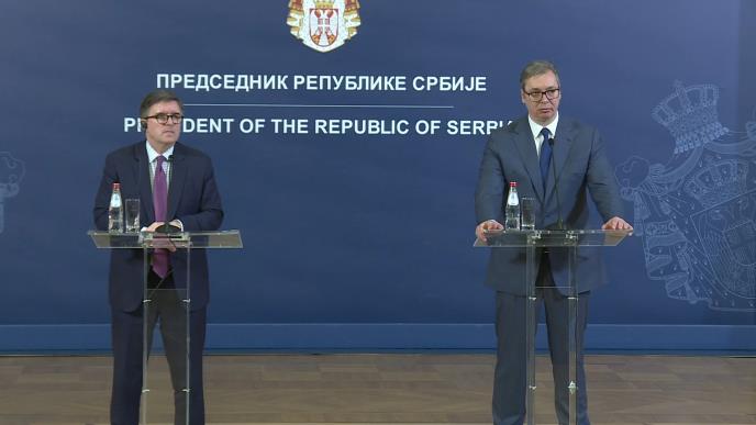 - Imao sam dobar razgovor sa predsendikom danas, to je deo programa u kom ću se videti i sa drugim predsednicima. Uvek je lepo vratiti se u Beograd. Jedna od tema danas bila je upravo to kako uspeva da razgovara sa svim zvaničnicima. Počeli smo razgovor o predstojećem putu na sednicu u UN, moram da budem jasan po pitanju američkog stava. Kosovo je obećalo da će sprovesti obavezu da osnuju SZO, to je od ključnog značaja. Učinićemo sve da pomognemo i ispunimo obećanja. Očekujem da će to biti tema u Njujorku. Hoću da govorim i o glasanju u UN u Savetu bezbednosti po pitanju genocida. I u mojoj zemlji je bilo razgovora o našoj istoriji. O mnogim temama smo danas zajedno pričali. Vlada Srbije je dobar partner vlade SAD. Ono što je posebno bitno to je da donesemo četiri slobode na kojima počiva EU. Sloboda kretanja, vlada SAD je ohrabrena time da se nastave razgovori pristupanju. Predsednik Vučić je glavni zagovornik, želimo da nastavimo ka tome da granice igraju što manju ulogu - rekao je on posle sastanka.