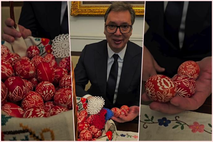 - Hristos Vaskrse, srećan praznik, našem narodu, našim ljudima gde goda žive. Ja sam dobio posebno poklon za Vaskrs od naših ljudi iz Orahovca i Velike Hoče, od naših Srba, koji žive u toj metohijskoj enklavi. I oni su spremili i ova divna jaja ofarbali i pripremili i poslali ovde nama u predsedništvo - istakao je Vučić i dodao: