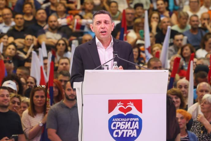 "Poštovani predsedniče Srbije i predsedniče svih Srba, idete u Njujork, idete u prokleto Lijevno, idete tamo gde vas čekaju moćni neprijatelji, idete tamo gde vas pratimo sa malo nade, ali sa puno ponosa. Kada vam bude najteže, kada vam budu pretili, kada vam budu govorili kroz zube, kada vam budu rekli da samo malo se umirite, jer metak koji je našao slovačkog premijera može da nađe i predsednika svih Srba, kada vam budu pretili i govorili da je malo onih koji su sa vama i iza vas, setite se Novog Sada i ove hale i ovih ljudi. Kada vam misli budu pune mržnje onih koji bi i vas i Srbiju da ne vide, ispunite svoje misli zvucima pobede koju ovi ljudi donose, koji vas vole i budite uvereni u pobedu kao što mi verujemo vama", poručio je Vulin na skupu koalicije u Novom Sadu.
