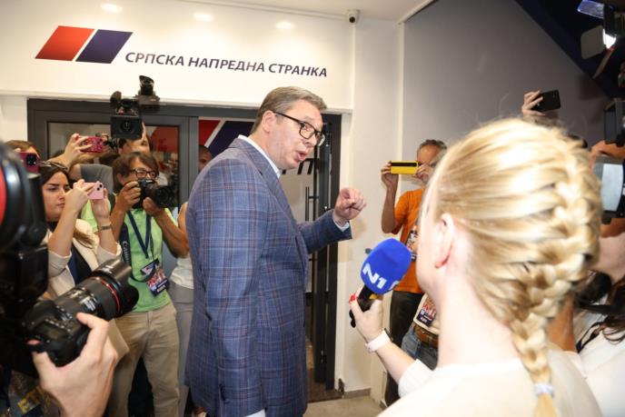 Predsednik Srbije Aleksandar Vučić i potpredsednica SNS Ana Brnabić stigli su večeras u štab Srpske napredne stranke.