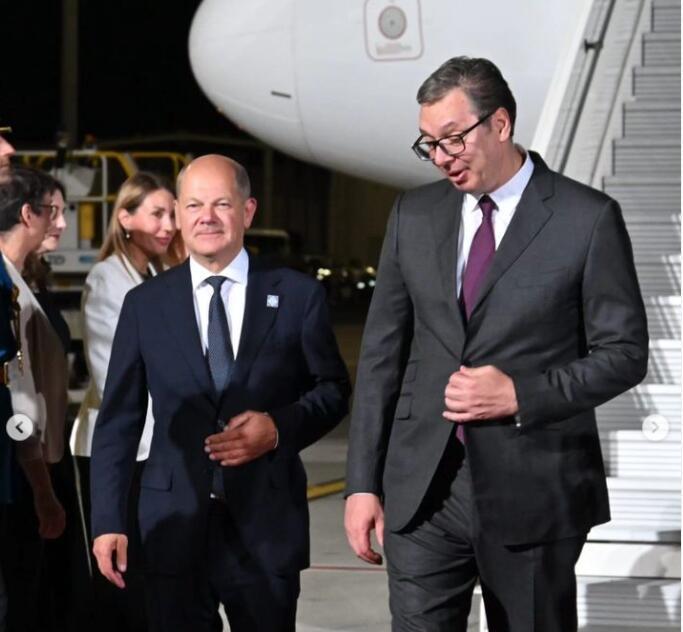 Predsednik Republike Srbije Alekandar Vučić dočekao je kancelara Savezne Republike Nemačke Olafa Šolca na aerodromu u Beogradu.