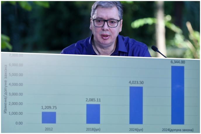 - Za prvo dete smo do sada izdvajali 3.307 evra ili 500.000 dinara jednokratno, ukupno 4.336 evra. To će biti od prvog novembra. Za drugo dete povećanje, iznosiće 5.126 evra. To je 600.000 dinara u 24 rate, plus 7.500 dinara, plus 135.000 prava na jednokratnu pomoć. Ukupno 742.500 dinara, 6.344 evra. To je ja mislim 2.000 evra više nego što je bilo do sada - rekao je predsednik Vučić.