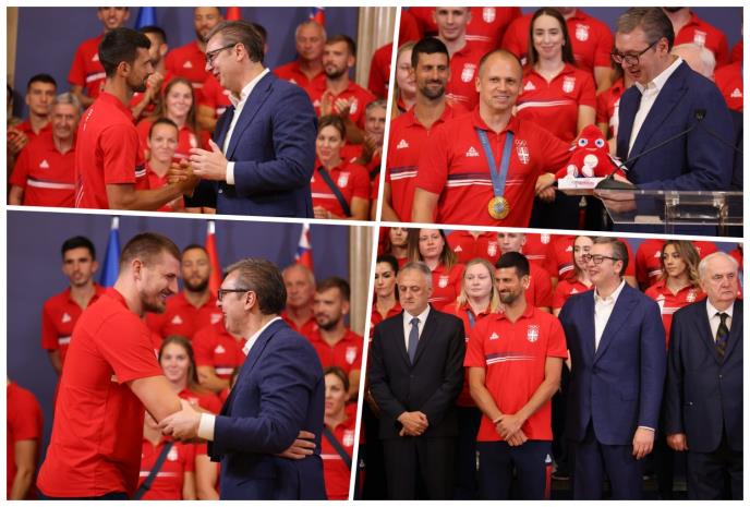 Predsednik Vučić jednom po jednom osvajaču medalja, uz nekoliko toplih reči i stisak ruke, čestita veliki uspeh postignut na Olimpijskim igrama u Parizu.