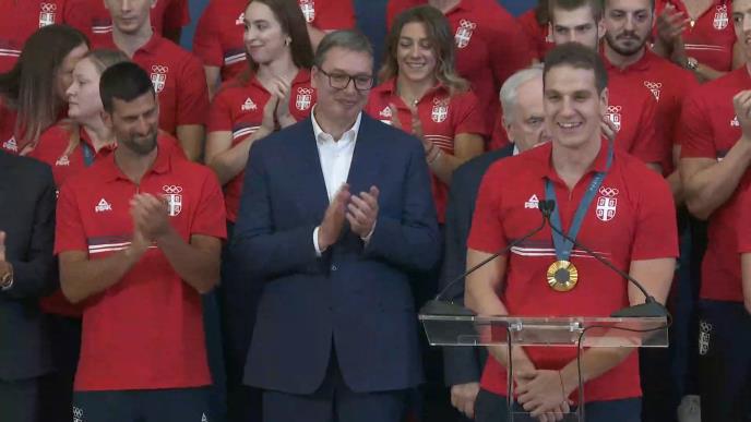 Kapiten zlatne vaterpolo reprezentacije Srbije Nikola Jakšić zahvalio se predsedniku Aleksandru Vučiću na prijemu koji je danas priredio za sve naše olimpijce u zgradi Predsedništva, kao i na podršci koju je "delfinima" pružao tokom Olimpijskih igara, čak i u momentima kada im je bilo teško.