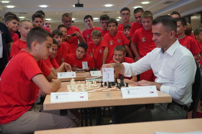Ministar je, na insistiranje nekoliko mališana, odigrao sa njima partiju šaha i uverio se da je zaista reč o budućim šampionima koji su već postali majstori drevne veštine.