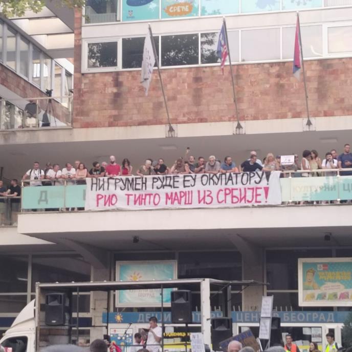 Tako je večeras raširen transparent na kome, između ostalog, piše: "Ni grumen rude EU okupatoru!". Ovaj stav po svemu sudeći dele i Savo Manojlović i Aleksandar Jovanović Ćuta koji su večeras od prestavnika opozicije viđeni na protestu.