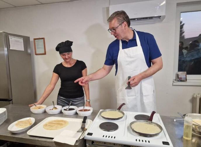 Što mi dobro stoji kecelja, je l’ da? Sećam se svojih vojničkih dana, kao i večite želje da u kantini imamo palačinke... Sad je došlo vreme da tu želju ispunim našim vojnicima. Mada, u onim mojim starim tiganjima uvek mi je uspevalo, a ovde ništa. Bolje da ostavim i da poslužim vojnike, to mi barem ide. Momci, izvolite! Predsednik Vučić nastaviće sutra, 5. septembra posetu Podrinju obilaskom saobraćajnice Šabac - Loznica, saopštila je danas Služba za saradnju sa medijima predsednika Republike.
