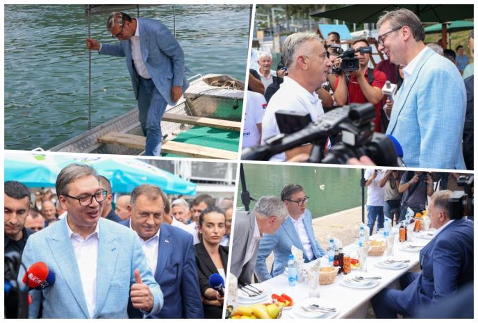 Predsednik je stigao čamcem, zajedno sa Dodikom. Dočekani su aplauzom, rakijom i poklonima. Na Zvorničkom jezeru osim ribolovaca, okupio se i veliki broj meštana. Vučića i Dodika dočekao je predsednik opštine Mali Zvornik Zoran Jevtić.