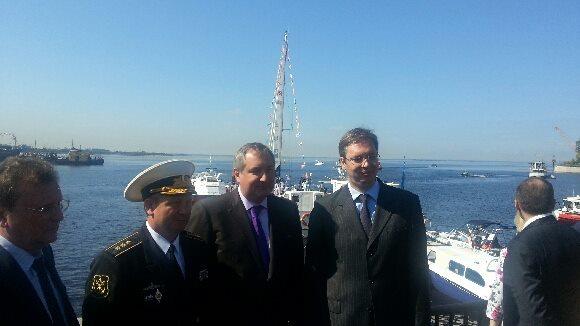 Vučić i Rogozin bili su gosti i na ruskom ratnom brodu koji je primer najsavremenije i najmodernije vojne tehnologije, saopštila je vladina Kancelarija za saradnju s medijima.