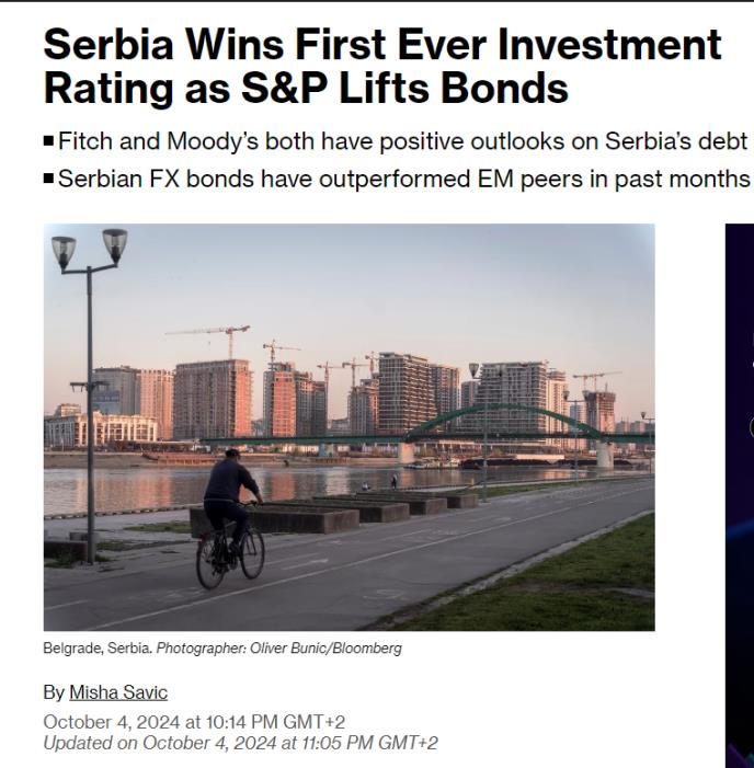 U tekstu agencije Blumberg kaže se da je S&P Global Ratings podigao kreditni rejting Srbije u stranoj valuti na BBB-, čime je zemlja izašla iz kategorije „đubre“ i dobila svoj prvi investicioni rejting. Ova ocena stavlja Srbiju u isti rang sa Mađarskom i Rumunijom i jedan stepen ispod Meksika, dok su ekonomski izgledi stabilni.