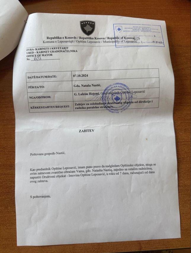 "Poštovana gospođo Nastić, kao predsednik Opštine Leposavić, imam puno pravo da nadgledam opštinske objekte, stoga se ovim zahtevom zvanično obraćam Vama, gospođo Nataša Nastić, da zajedno sa ostalim radnicima napustite društveni objekat imovine opštine Leposavić, u roku od sedam dana, računajući od dana ovog zahteva", stoji u zahtevu koji je Hetemi uručio.