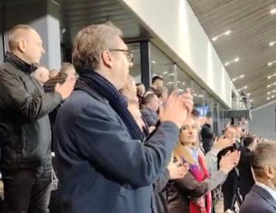 Predsednik Srbije Aleksandar Vučić bodrio je našu fudbalsku reprezentaciju na utakmici Lige nacija protiv Švajcarske u Leskovcu.