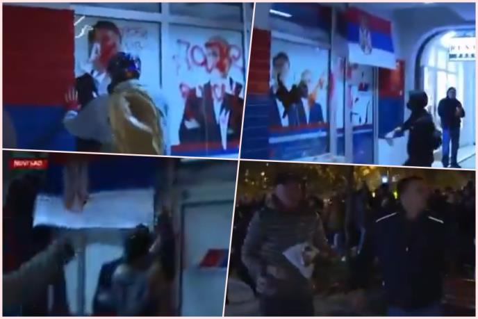 LETE KAMENICE, FARBOM ZASIPAJU PROSTORIJE SNS, POGODILI ŽENU U GLAVU! Neviđeno divljaštvo na ulicama Novog Sada: Vređaju obezbeđenje, staklo puca na sve strane
