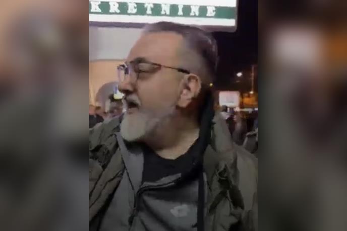 Kako se vidi na snimku, Čiplić je došao ispred prostorija Srpske napredne stranke u Novom Sadu, dok su mu prisutni članovi SNS-a oduzeli čekić i savladali ga.